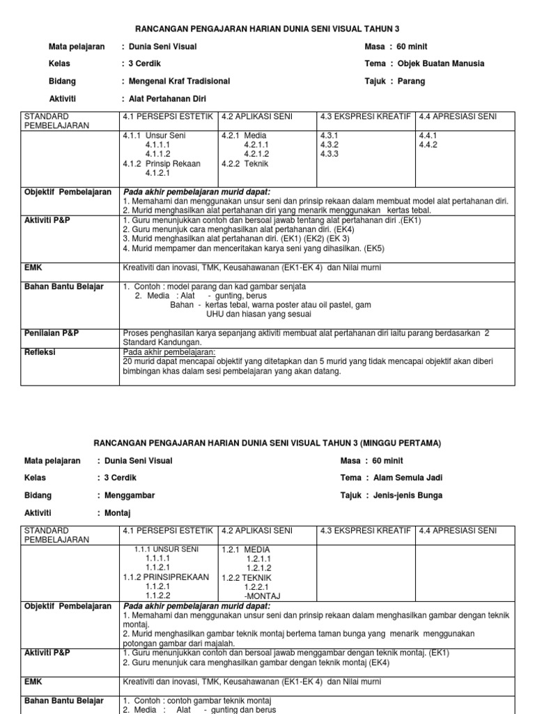 Rancangan Pengajaran Harian Dunia Seni Visual Tahun 3 Pdf